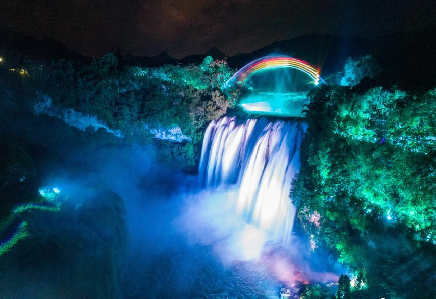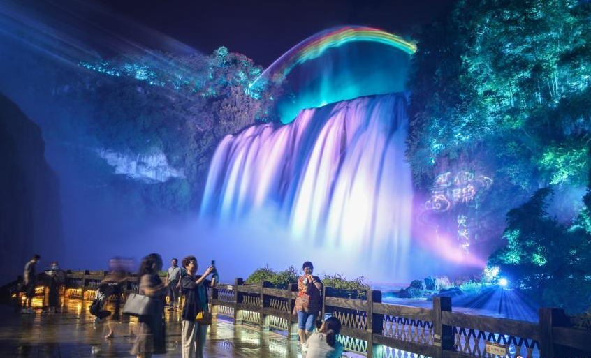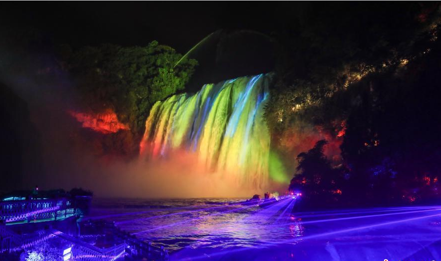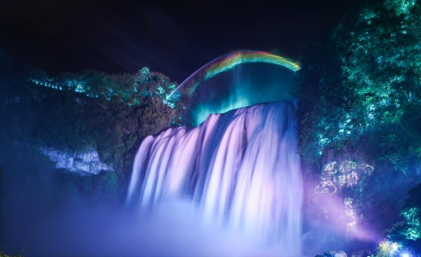 走進(jìn)夜幕下的貴州黃果樹(shù)瀑布,領(lǐng)略黃果樹(shù)瀑布與日間壯美不同的驚艷夜色。一場(chǎng)“3D夢(mèng)幻”光影秀每天都會(huì )在這里上演,燈光和3D投影在黃果樹(shù)瀑布上變換著(zhù)各種視覺(jué)特效,瀑布在光影秀中如夢(mèng)如幻,虹光漫天,橫亙天幕,山水光影聯(lián)動(dòng),帶給游客有別于日間體驗的沉浸式“光影盛宴”,流光溢彩又美又仙。