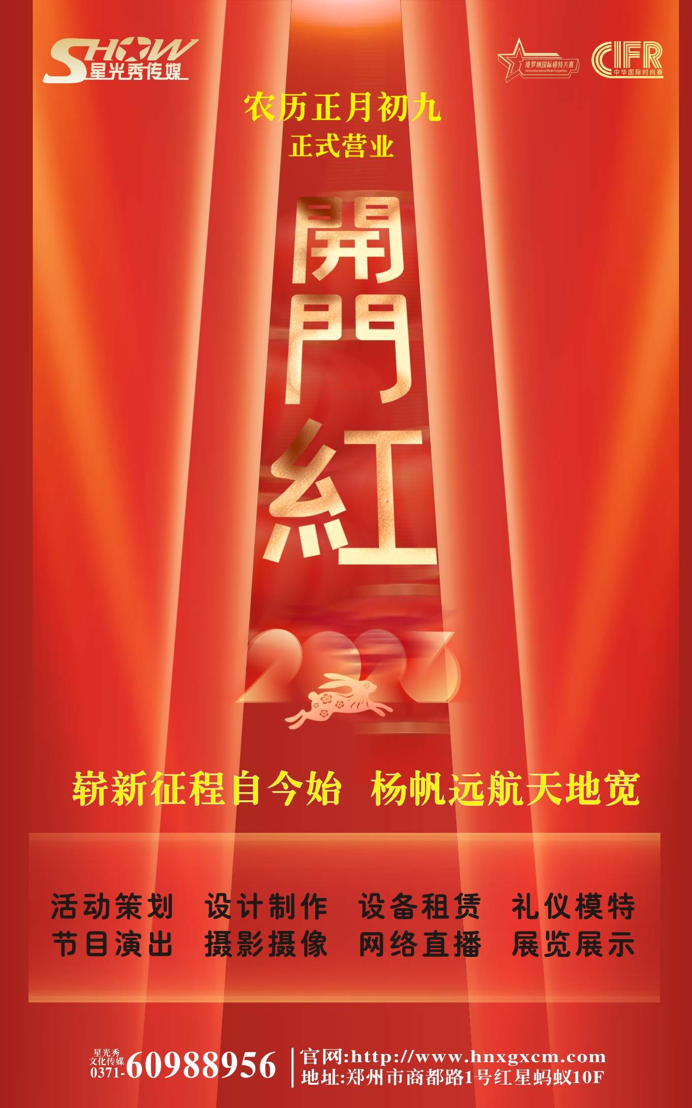 癸卯年正月初九,九時(shí)五十八,星光秀文化傳媒開(kāi)門(mén)營(yíng)業(yè),歡迎親朋好友來(lái)此做客。!