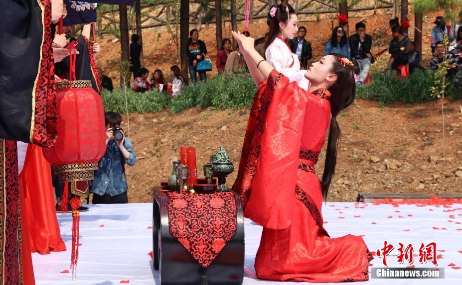 3月31日,在三國歷史文化名城湖北當陽(yáng),一場(chǎng)漢服傳統婚禮秀在該市廟前鎮關(guān)雎河畔進(jìn)行,以此弘揚傳統婚俗文化。當天,“愛(ài)在當陽(yáng),緣來(lái)是你”當陽(yáng)市第五屆相親文化節開(kāi)幕,吸引了來(lái)自全國各地的近萬(wàn)名游客前來(lái),現場(chǎng)不僅舉行了盛大的漢服婚禮秀,還在水面上設置了500米的櫻花長(cháng)廊,場(chǎng)面唯美,風(fēng)景如畫(huà)。據悉,該活動(dòng)將持續到4月1日。