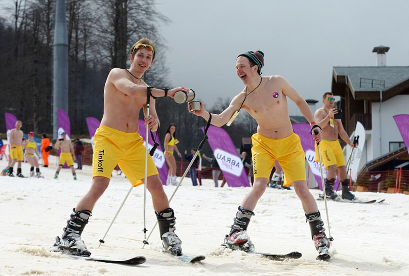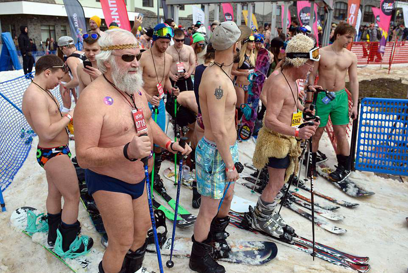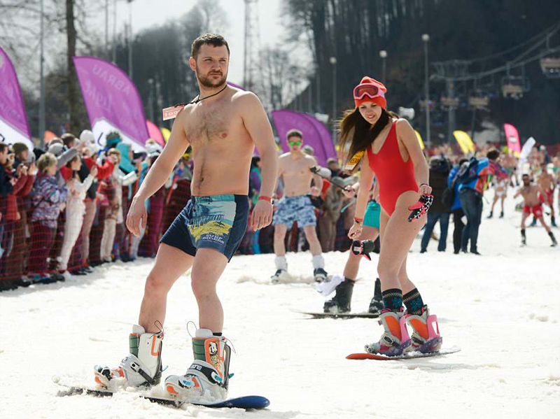 4月1日復活節這一天,在俄羅斯索契,近2000名只穿著(zhù)比基尼或游泳褲的雪上運動(dòng)愛(ài)好者參加了被稱(chēng)為“世界上最瘋狂的滑雪活動(dòng)”的戶(hù)外活動(dòng)。