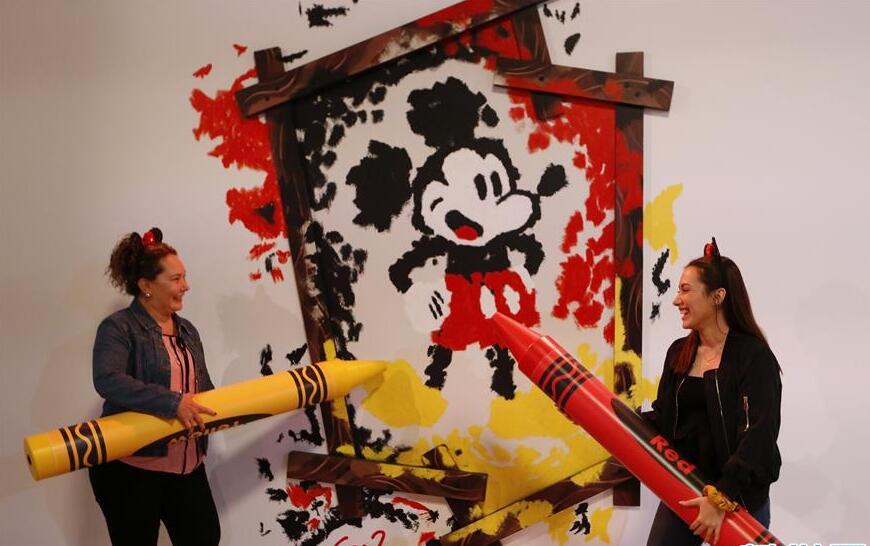 6月20日,在美國加利福尼亞州阿納海姆迪士尼園區,一名游客在慶祝米老鼠動(dòng)漫形象誕生90周年展覽上留影。 2018年11月18日是迪士尼米老鼠動(dòng)漫形象誕生90周年的日子。在接下來(lái)的一年中,全球多地的迪士尼樂(lè )園舉辦慶;顒(dòng),為米老鼠慶生。