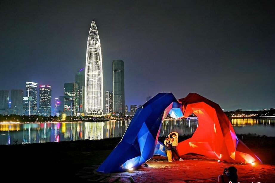 廣東深圳人才公園的“愛(ài)心”雕塑與地標建筑“春筍”交相輝映,燈光璀璨夜色美。