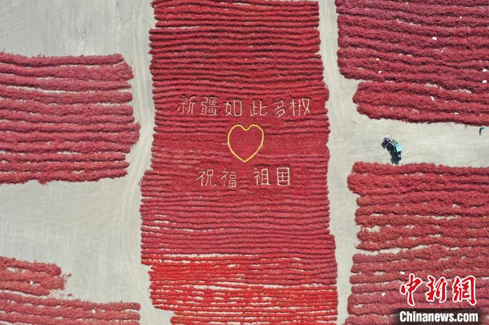 秋高氣爽,艷陽(yáng)高照,素有“辣椒之鄉”的新疆博湖縣,又迎來(lái)了一個(gè)豐收季;鸺t的辣椒鋪滿(mǎn)了整個(gè)晾曬場(chǎng),在一望無(wú)際的金秋田野上顯得十分耀眼。當地村民用豐收的辣椒和玉米擺成“祝福祖國”“歡度國慶”等圖案慶祝國慶。