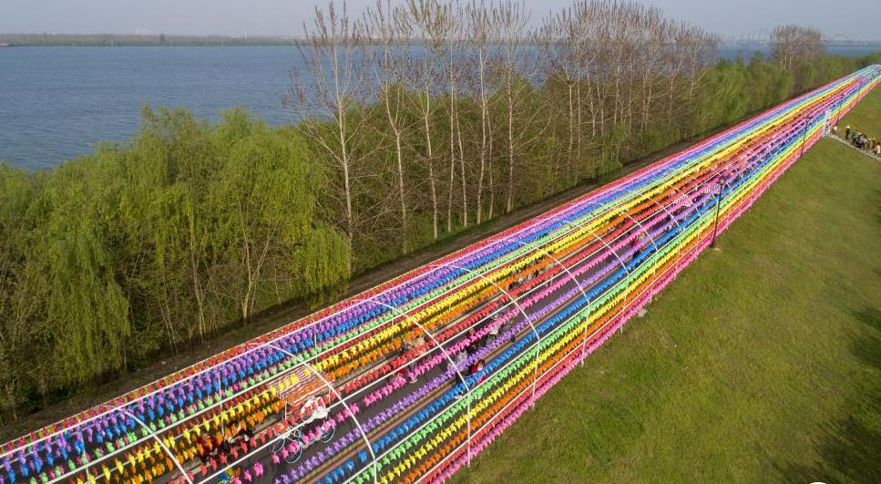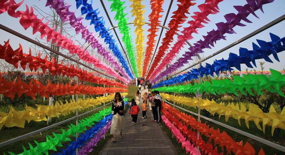 3月28日,湖北省襄陽(yáng)市,人們在沿江大道七彩風(fēng)車(chē)長(cháng)廊里游玩。在襄城區沿江大道的河堤綠道上,一條長(cháng)達300米、由十萬(wàn)個(gè)七彩風(fēng)車(chē)搭建的彩虹走廊吸引了眾多游客。漫步在炫麗斑斕的風(fēng)車(chē)長(cháng)廊,仿佛走進(jìn)夢(mèng)幻般的彩虹世界。一陣風(fēng)吹過(guò),只聽(tīng)見(jiàn)快速旋轉的風(fēng)車(chē)發(fā)出嘩啦啦的聲響,仿佛傳來(lái)春天的問(wèn)候,成為一道色彩靚麗、壯觀(guān)無(wú)比的風(fēng)景線(xiàn)。